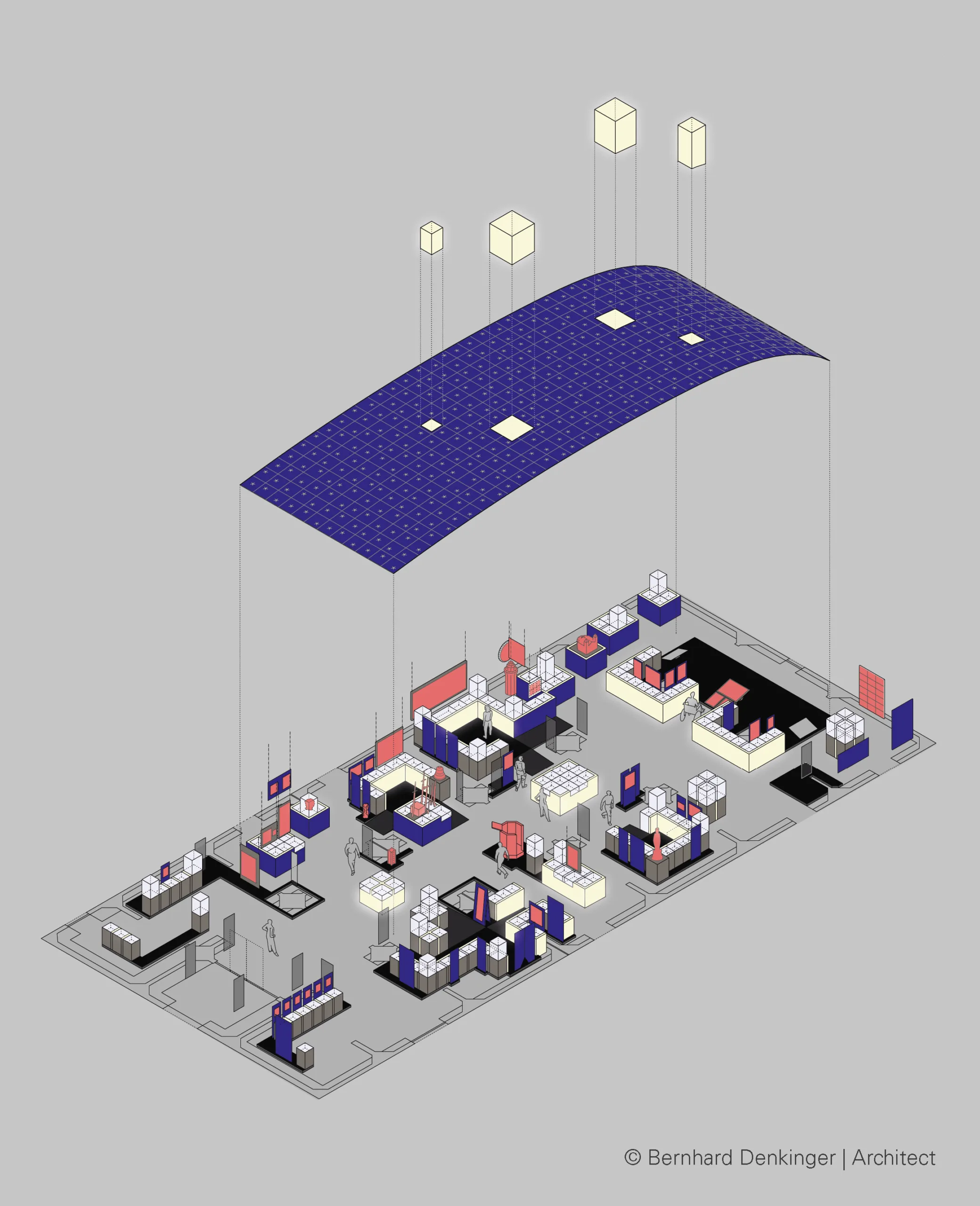 Grundriss: Asymmetrisch angeordnete, frei im Raum stehende Inseln bilden eine offene Struktur. Sie werden durch ein abgehängtes, gekrümmtes Dach verbunden.