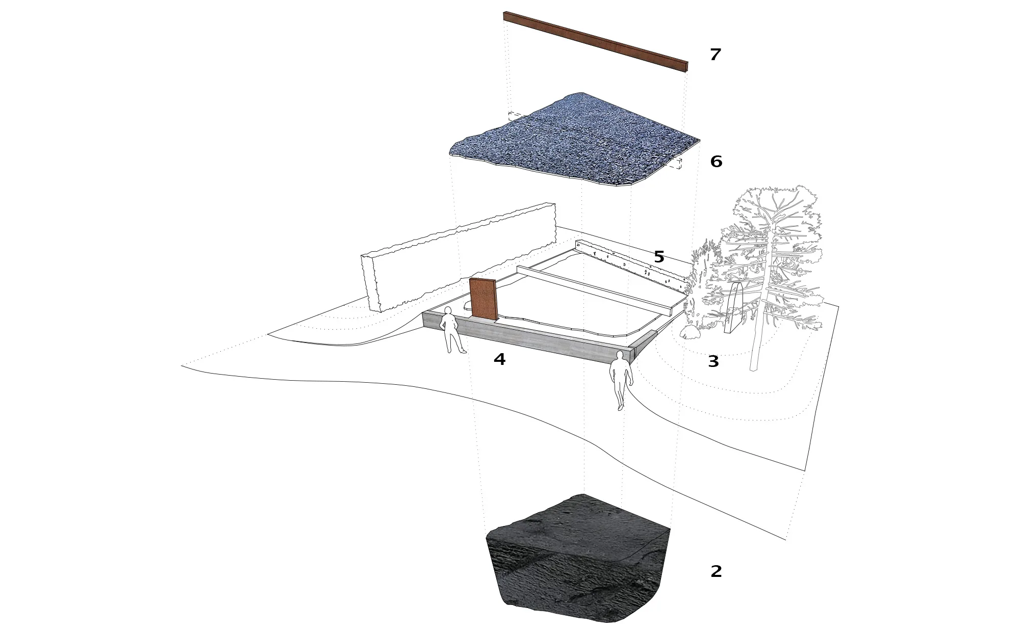 Unser Projekt markiert die Stelle und macht die Lage der Asche an der Oberfläche wieder sichtbar. Der Entwurf nimmt die Topografie des Geländes auf, das nach zwei Seiten geneigt ist. Das Gelände „fließt“ unter der Installation hindurch, bis zu einer Stützwand aus Beton. Die Stützwand trägt eine Stele, die in einen Dialog mit einem bestehenden Gedenkstein tritt. Die Lage der Aschengrube wird durch einen Belag aus dunkelgrauem Basaltbruch gekennzeichnet, eingefasst von Cortenstahl dessen polygonaler Verlauf die unregelmäßigen Ränder der Aschengrube nachzeichnet.
